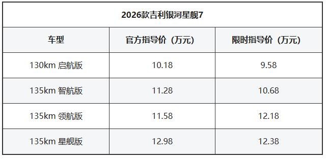 11月19日,吉利銀河官方宣布2026款吉利銀河星艦7 EM-i迎來正式上市,新車共推出4款車型,官方指導價10.18-12.98萬元,限時售價9.58-12.38萬元。